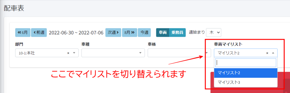 活用テクニック 便利な使い方 配車表で表示する車両や乗務員を設定したい 配車表に担当していない車両や乗務員さんが出ていて見にくいな・・・。 そんな時は、車両・乗務員マイリストを使って自分の担当する車両や乗務員さんだけ表示することができます。 しかも、マイリストでは複数のリストを設定して、配車表で簡単に切り替えることもできるんです。 mylist-usage-1 ケースに応じてマイリストを設定すればさらに便利になりますね。 車両・乗務員マイリストの設定方法は以下をご参照ください。 2022.06.07 マイリスト(乗務員・車両)を設定する マイリストの設定方法の説明です。マイリストを設定すると、配車表で任意の乗務員・車両に絞り込んで表示する事ができます。... 便利な使い方, よくある質問 乗務員マイリスト, 車両マイリスト, 配車表