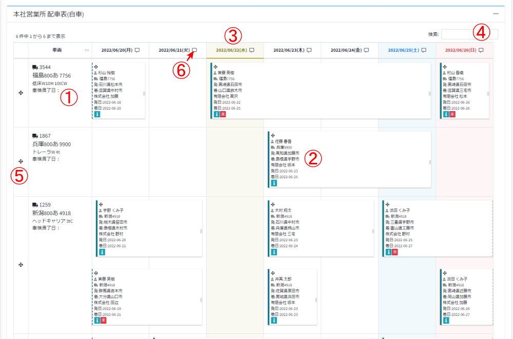初回表示時、配車表ではユーザーの所属する部門の今日の日付の2日前から1週間の自車の運行をカレンダー形式で確認することができます。