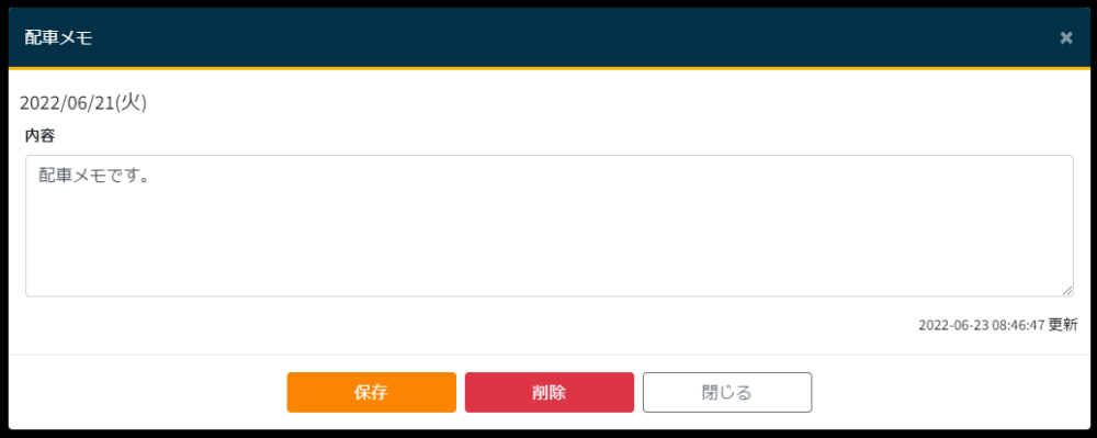 配車メモは日付と部門ごとに1つ作成されますので、他の配車ユーザーへのお知らせなどへも活用できます。