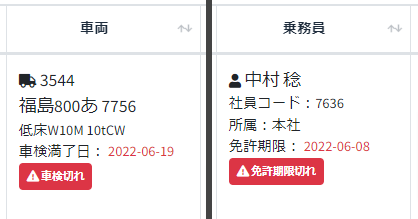 また、車両の場合は車検切れ、間近のアラートが、乗務員の場合は免許更新間近、期限切れのアラートが表示されます。