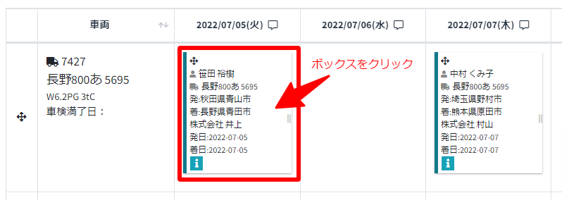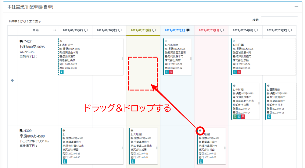 - 複製したい運行のボックスの左上のクロスした矢印マークをドラッグして、自車の場合は複製・移動したい日付および車両/乗務員の交差するマスへ、傭車の場合は複製・移動したい日付のマスへ移動しドロップします。
