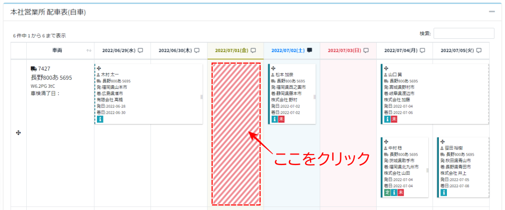 - 自車配車表の場合は設定したい車両/乗務員と発日が交差するマスを、傭車配車表の場合は設定したい日付のマスをクリックします。
