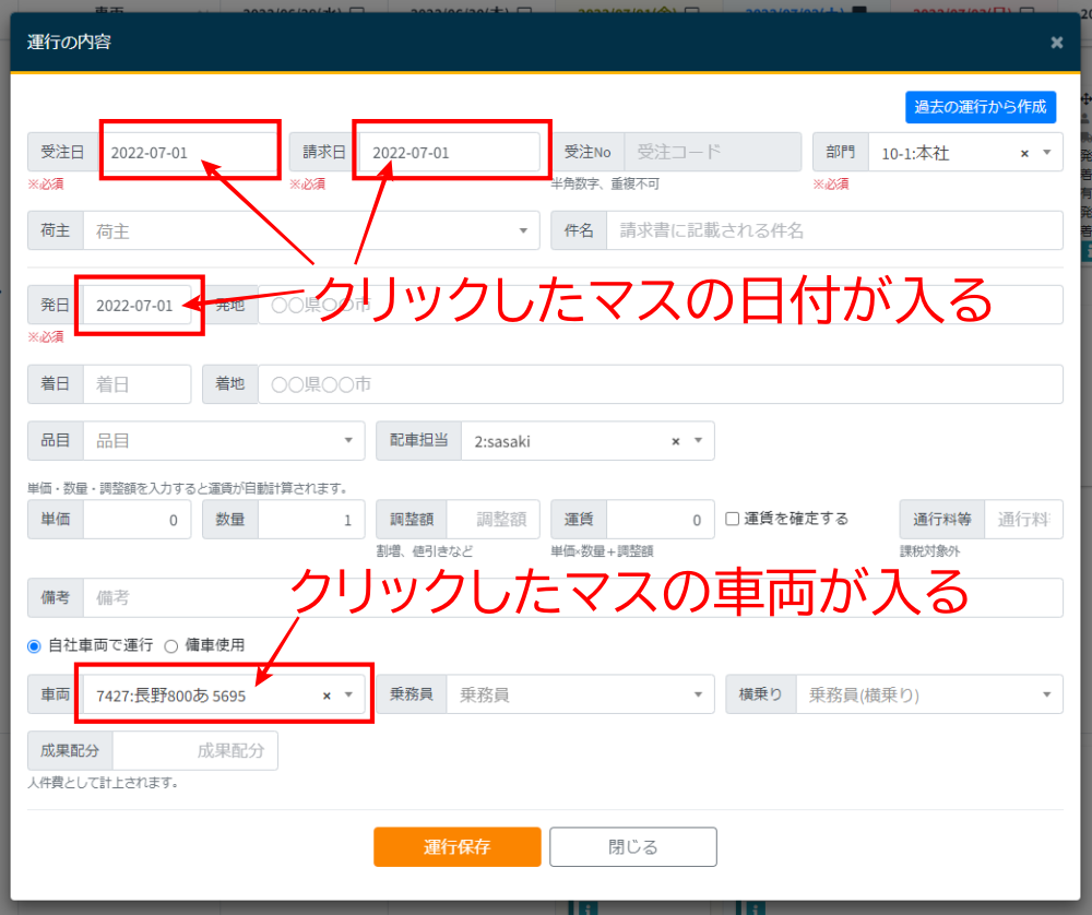 日付から傭車の運行情報を新規作成できます。