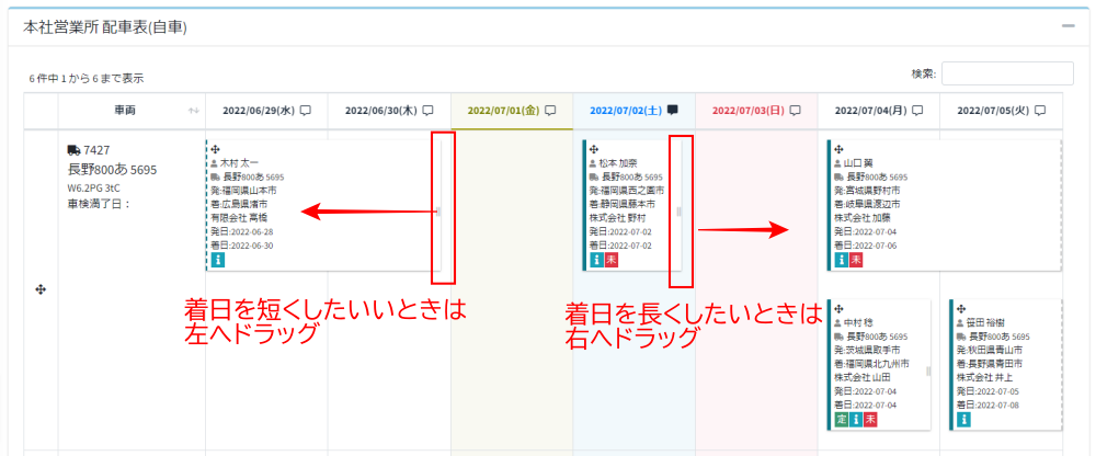 4.運行ボックスの右端を伸縮して着日を変更する(自車配車表のみ)