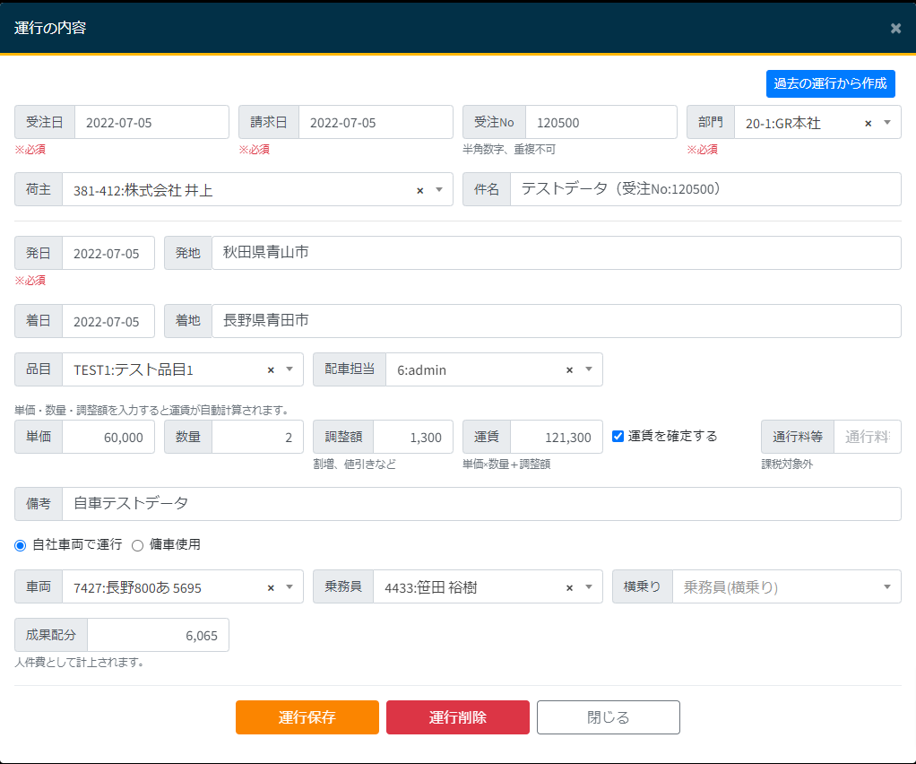 - 発日と自車配車表の場合は車両/乗務員が入力されたフォームが開くので必要事項を入力し登録します。
