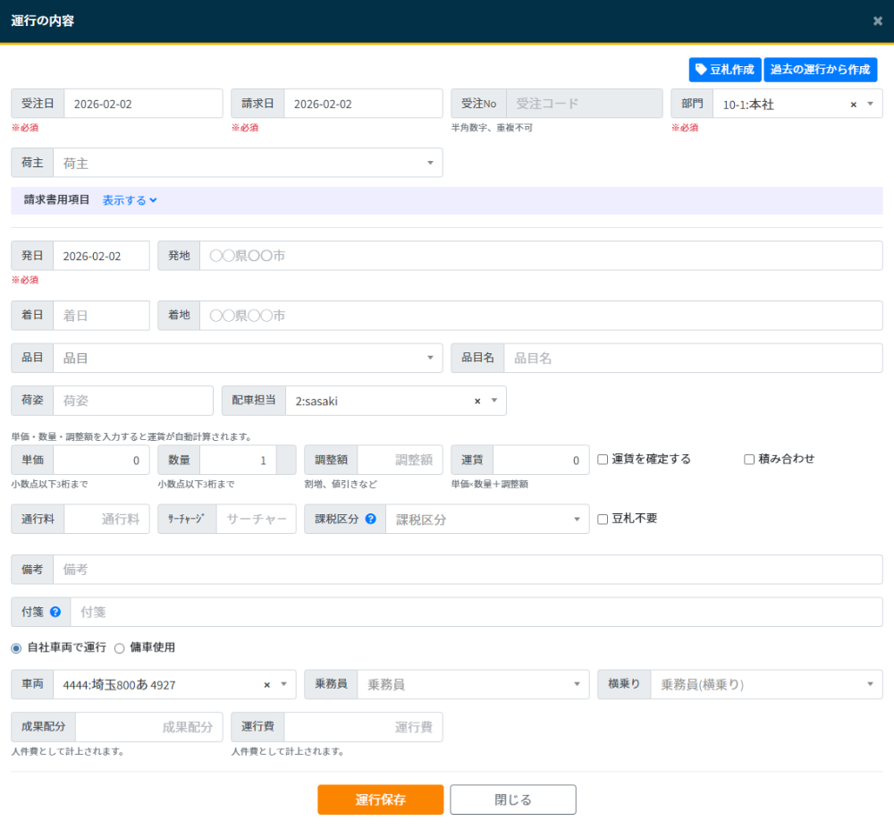 - 備考:運行の備考を入力します。※請求書レイアウトによっては請求書に表示される場合があります。