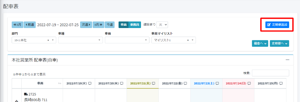 - 配車表画面の右上にある定期便追加ボタンをクリックします。