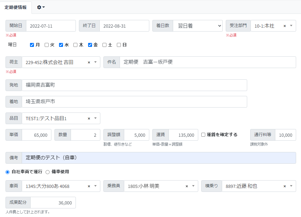 決まった曜日や毎日、同じ運行がある場合は定期便として登録すると便利です。