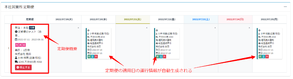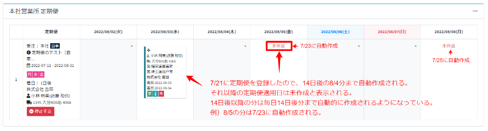 上記例の場合、7/21に定期便を作成したので、14日後の8/4までの定期便適用日に受注・運行情報が自動作成されています。
