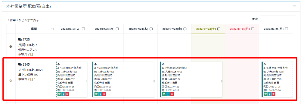 自動作成された受注・運行情報は定期便配車表のほかに、自車であれば自車配車表に、傭車であれば傭車配車表に表示されます。