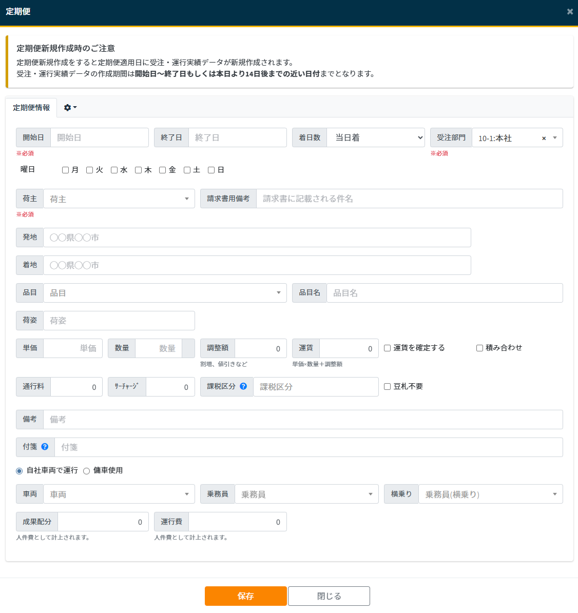※請求書のレイアウト設定によりますが、ここに入力されたものは請求書の明細に記載されます。未入力の場合はシステムで設定された項目が記載されます。必要に応じて設定してください。 - 発地:定期便の発地を入力します。