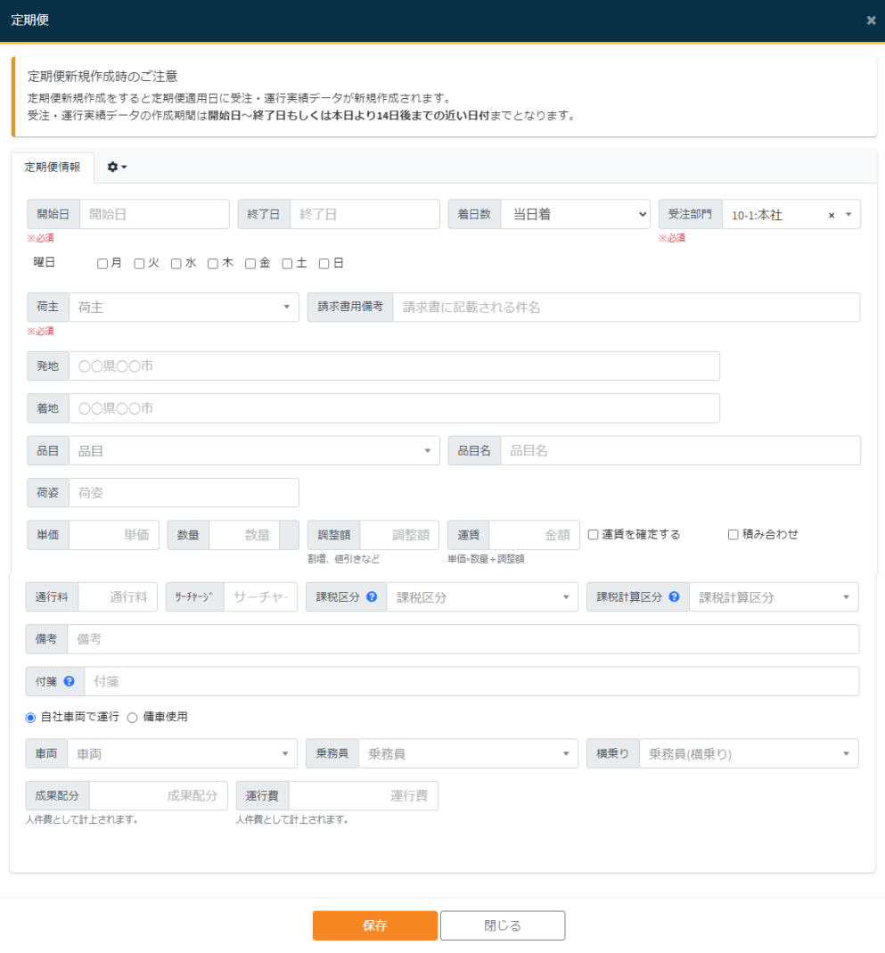 - 曜日:定期便の運行曜日をチェックしてください。チェックがない場合は全曜日定期便が作成されます。