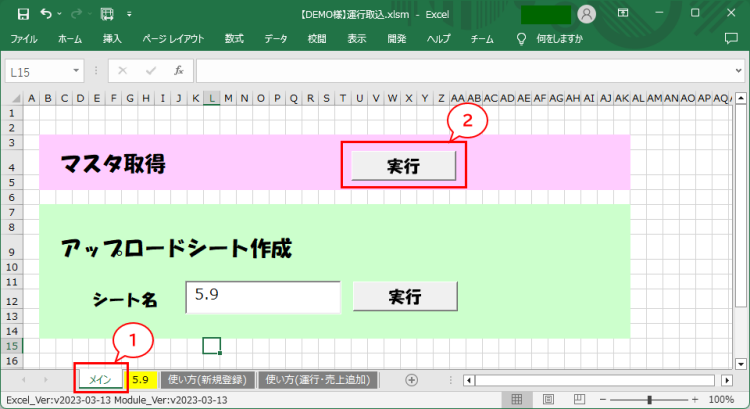 使い方ガイド 運行取込エクセル 最新マスタの取得方法 運行取込エクセルを入力中に取引先、品名、車両、社員などのマスタをSMART TRUCKに新規登録した場合、最新情報をエクセル側に反映させる方法は、以下のとおりです。 最新情報の取得は、運行取込エクセルを開く時にも行われています。 メインシートをクリックします。 実行ボタンをクリックします。 メッセージが表示されたら、OKボタンをクリックして下さい。 ※最新のマスタデータの取得に失敗する事があります。その場合は、何度かマスタ取得を実行して下さい。 使い方ガイド, 運行取込エクセル マスタ更新, 運行取込エクセル