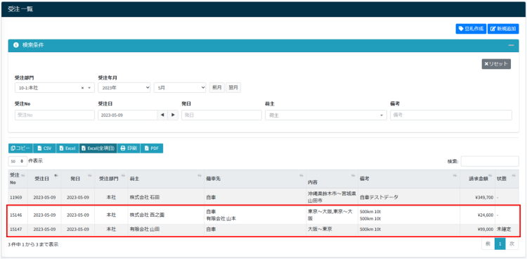 - 受注No:受注NoはSMART TRUCK側で採番されるため新しい受注を登録する時は入力しないで下さい。