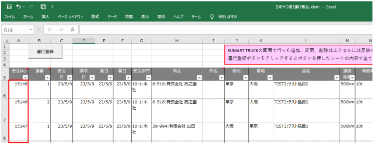 ※既存の受注Noを入力してしまうと上書きされるためご注意下さい。 - 連番:複数運行の場合は、1から連番の数値を入力して下さい。