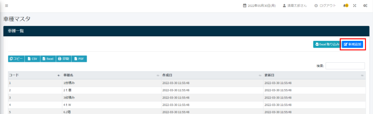 2. 車種一覧画面の右上にある新規追加ボタンをクリックします。