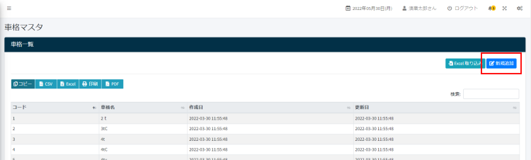 - サイドメニューの「車両管理」> 「マスタメンテナンス」> 「車格マスタ」をクリックします。