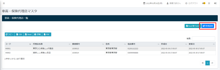- 車両・保険代理店一覧画面の右上にある新規追加ボタンをクリックします。