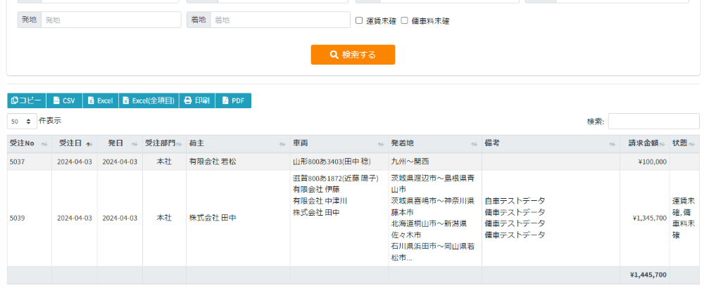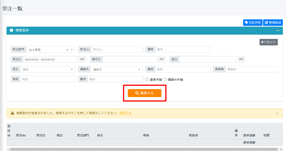 1. 受注一覧画面で検索条件を入力後、検索ボタンを押してください。