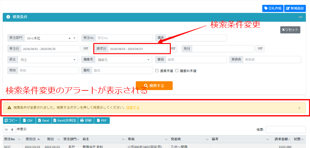 1. 検索条件を変更すると、「検索条件が変更されました」というアラートが出ます。