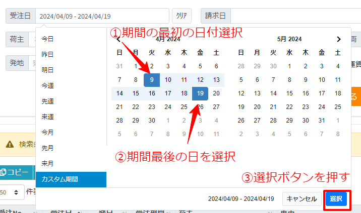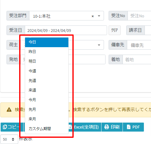 受注日、請求日、発日は、「今日、昨日、今週、来週、先月」など期間をプルダウンから選択する方法と、プルダウンの中から「カスタム期間」を選択して好きな期間を選択する方法があります。