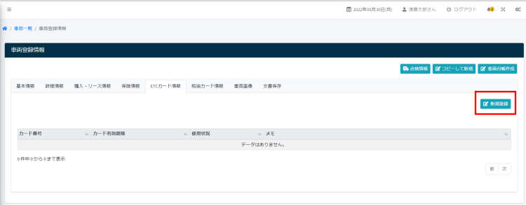 - ETCカード情報の右上にある新規登録ボタンをクリックします。
