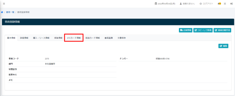 - 車両登録情報が表示されたら、ETCカード情報タブをクリックします。