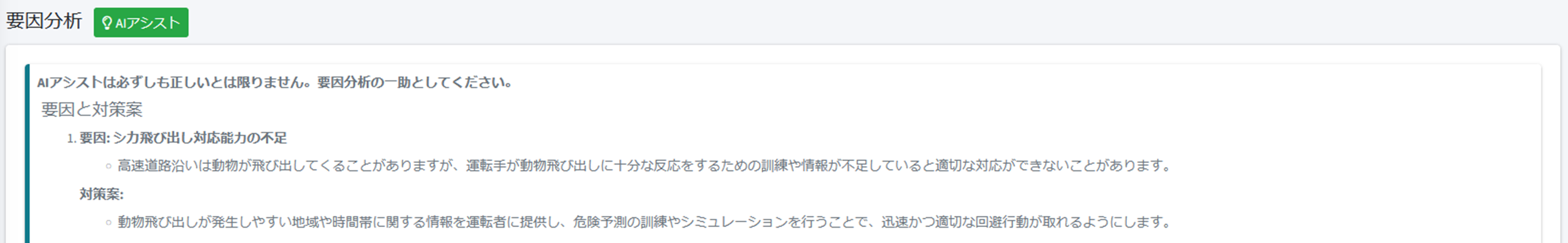 要因対策では、事故の概要や天候をもとにAIがアシストを行います。対策の一助としてください。