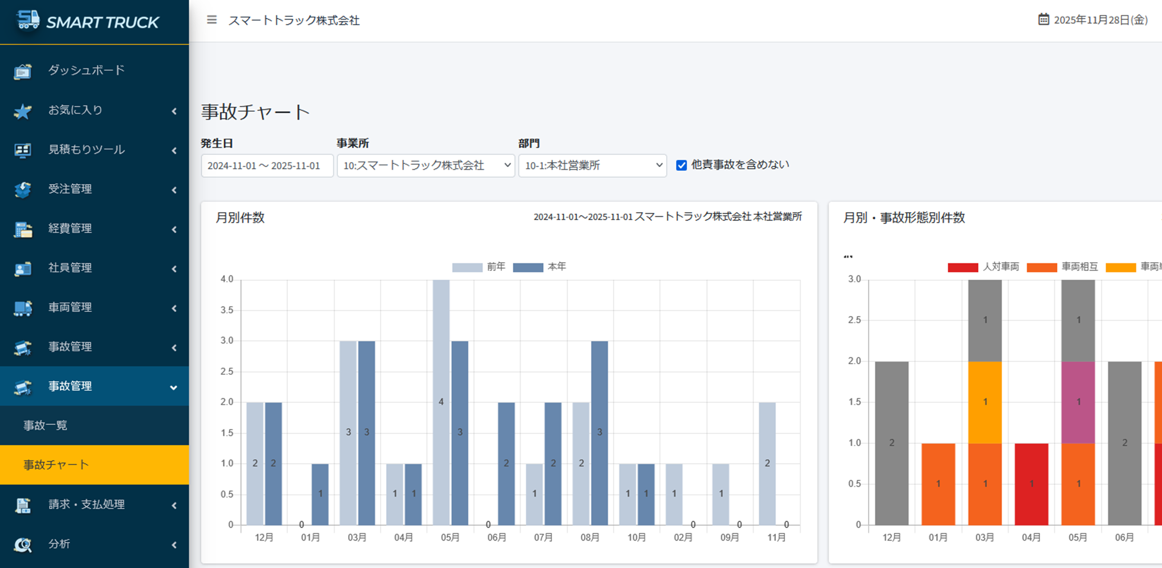 1. サイドメニューの「事故管理」から「事故チャート」をクリックします。