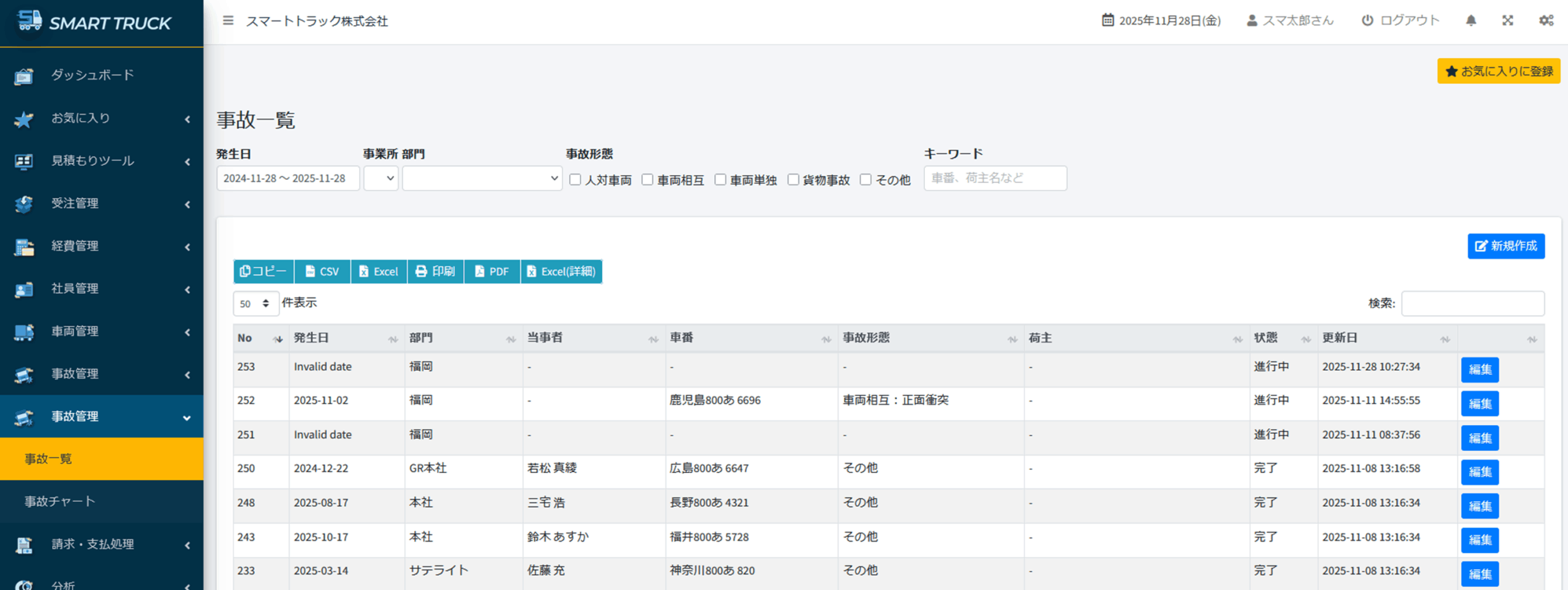 1. サイドメニューの「事故管理」から「事故一覧」をクリックします。