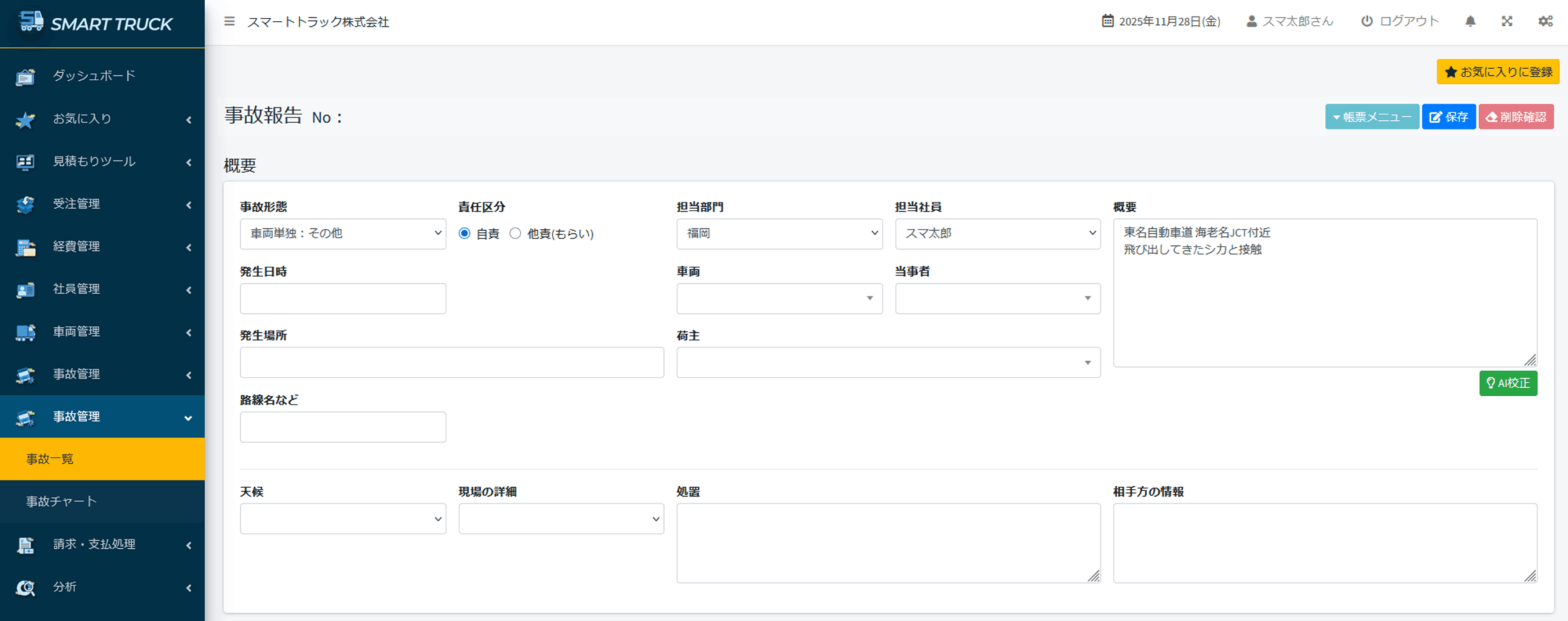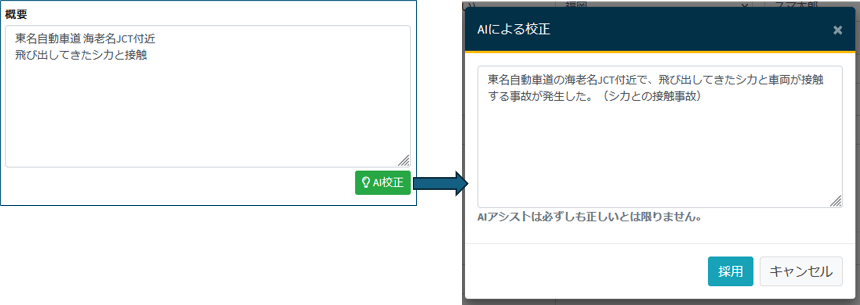 事故の概要を入力時、「AI校正」をクリックすると、校正案が表示されます。
