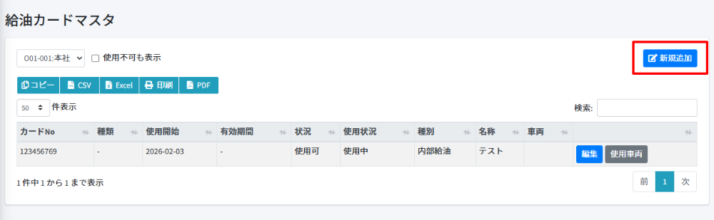 - 給油カード一覧画面の右上にある新規追加ボタンをクリックします。