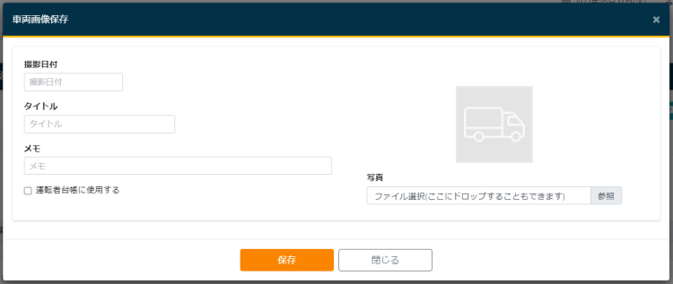 1. 写真:車両の写真を登録します。参照を押して画像を選択するか、もしくはドラッグ&ドロップでも登録できます。推奨サイズは縦500px横500px以上(正方形)となります。