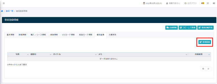 4. 車両画像情報の右上にある新規登録ボタンをクリックします。