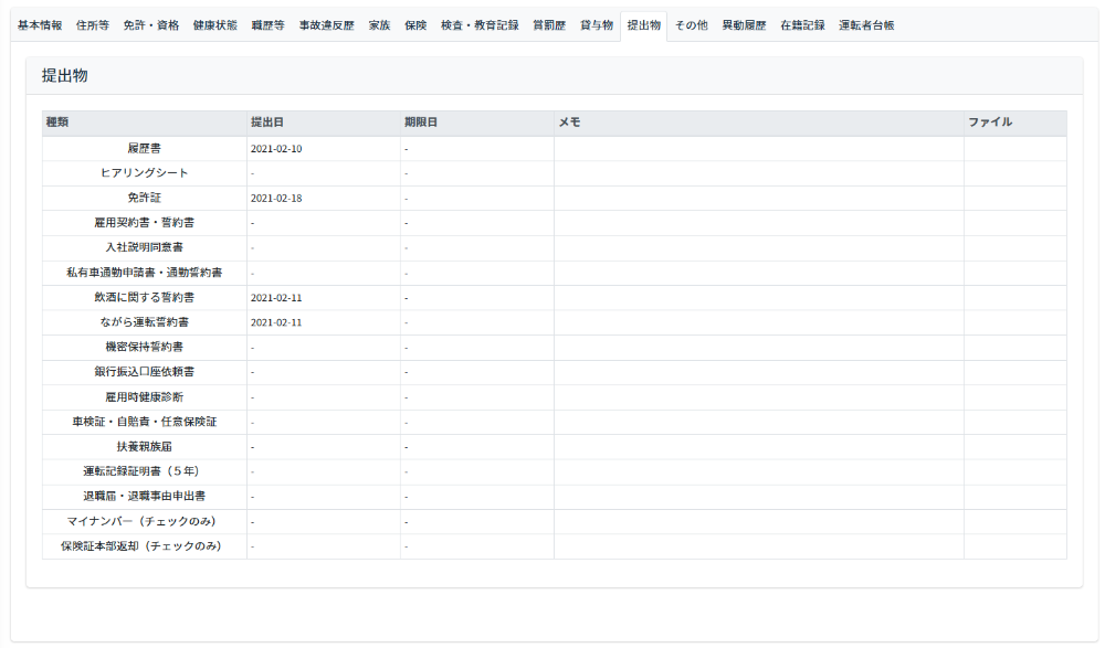 - 社員登録情報が表示されたら、提出物タブをクリックします。