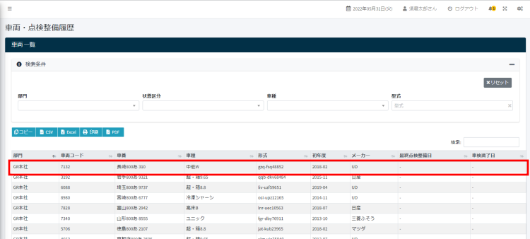 - サイドメニューの「車両管理」> 「車両・点検整備履歴」をクリックします。