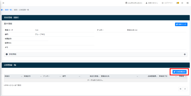 - 点検整備一覧が表示されたら、点検整備追加をクリックします。