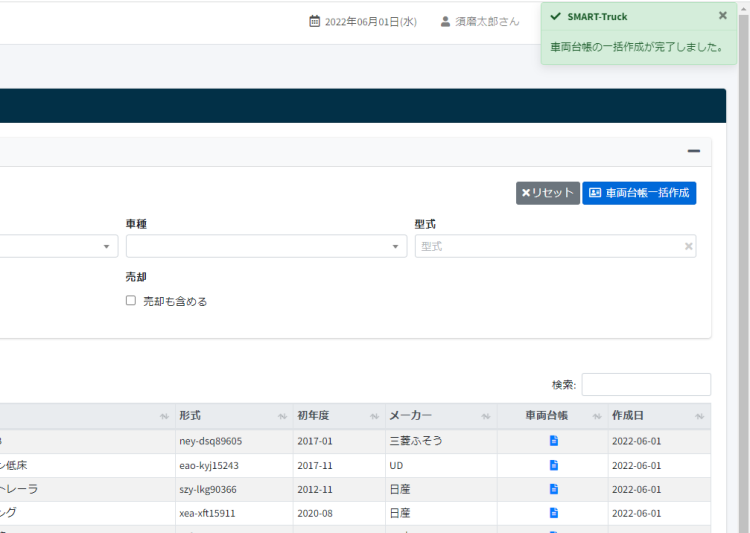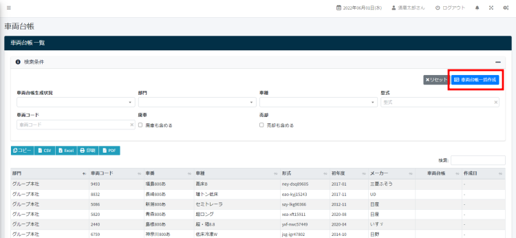2. 車両台帳一覧画面が表示されたら、画面右上の車両台帳一括作成をクリックします。