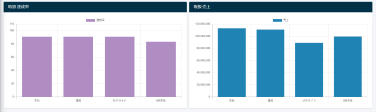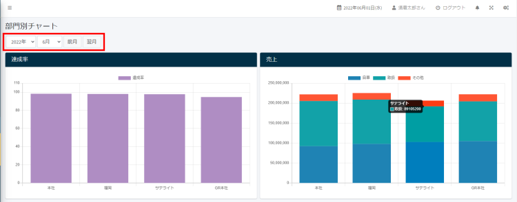 対象年月の部門毎の達成率と売上状況の確認をすることができます。