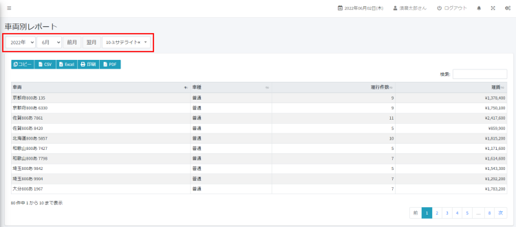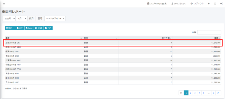 使い方ガイド 分析 車両別の運行の集計結果を確認する 1.車両別レポートを表示する サイドメニューの「分析」> 「売上表」> 「車両別レポート」をクリックします。 車両別レポートが表示されます。対象年月および受注部門を設定します。 初回はログインユーザーが所属している部門が自動的に選択されています。 部門を選択しない場合はすべての部門が対象となります。 運行の詳細が確認したい場合は、該当する車両をクリックします。 運賃の内容が表示されます。 使い方ガイド, 分析 車両, 運行集計