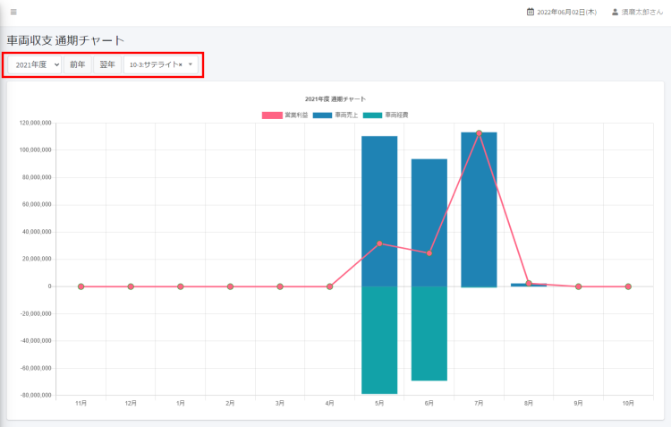 使い方ガイド 分析 車両収支を確認する(通期) 1.車両収支通期チャートを表示する サイドメニューの「分析」> 「車両収支」> 「通期チャート」をクリックします。 車両収支の通期チャートが表示されます。対象年度を設定します。 使い方ガイド, 分析 車両収支