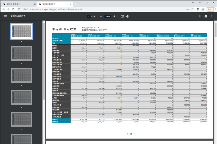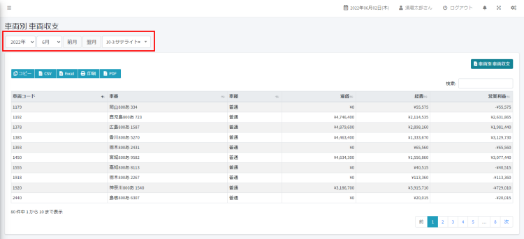 2. 車両別車両収支が表示されます。対象年月、部門を設定します。