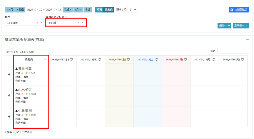 配車表で設定したマイリストを選択すると、登録した乗務員・車両のみ登録した順番で表示されます。