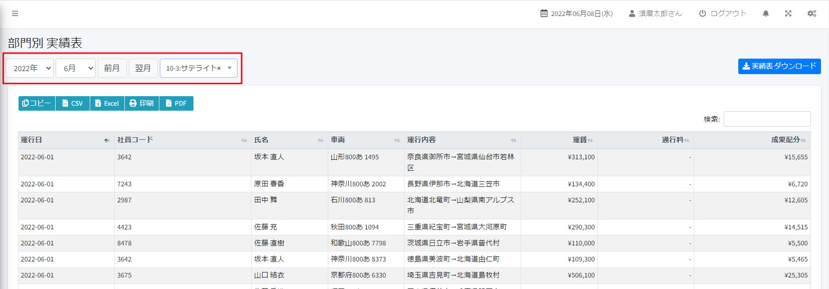 使い方ガイド 受注情報 部門別実績を確認する 1.稼働状況を表示する サイドメニューの「受注管理」> 「部門別実績表」をクリックします。 部門別 実績表が表示されます。対象年月、部門を設定します。 使い方ガイド, 受注情報 部門別実績表