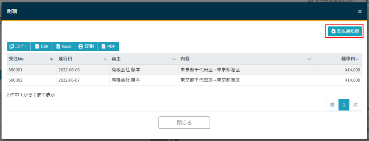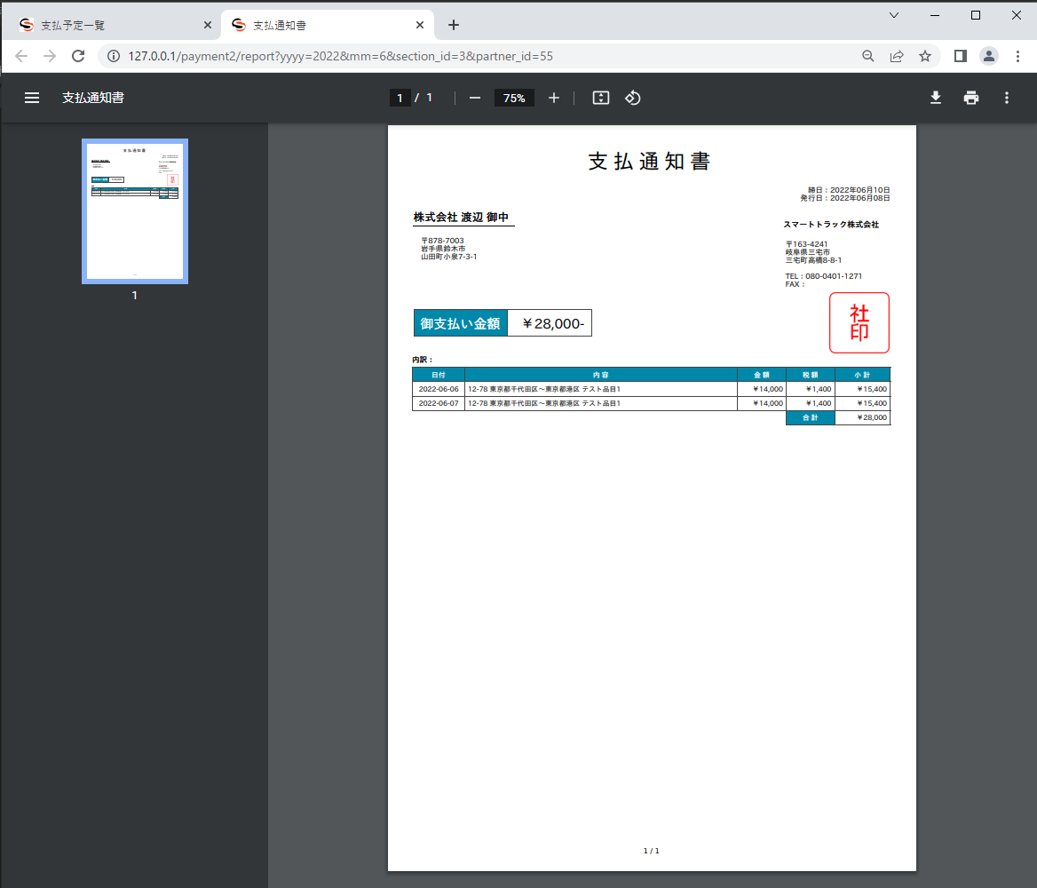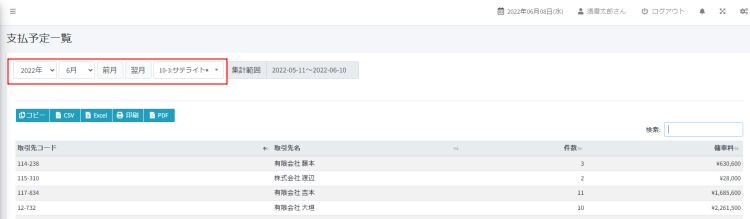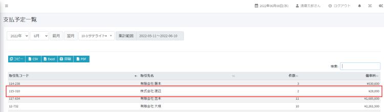 使い方ガイド 請求・支払処理 支払通知書を作成する 1.支払通知書の作成 サイドメニューの「請求・支払処理」> 「支払予定一覧」をクリックします。 支払予定一覧表が表示されます。対象年月、部門を設定します。 ※集計期間は部門マスタで設定した締日を基準とした期間となります。 支払予定一覧画面から該当する取引先をクリックします。 支払明細が表示されたら、画面右上の支払通知書をクリックします。 支払通知書が表示されます。 2022.11.04 宛名の表示仕様 請求書・支払通知・豆札の宛名は以下のような仕様で設定されます。 標準で「御中」の敬称が付きますが、取引先マスタの設定によってカスタマイ... 使い方ガイド, 請求・支払処理 傭車先, 支払通知書