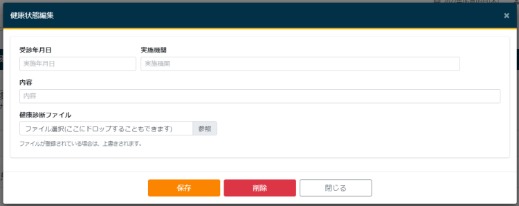1. 健康診断ファイル:ファイルを登録します。参照を押してファイルデータを選択するか、もしくはドラッグ&ドロップでも登録できます。ファイルサイズは、5MBまでにしてください。
