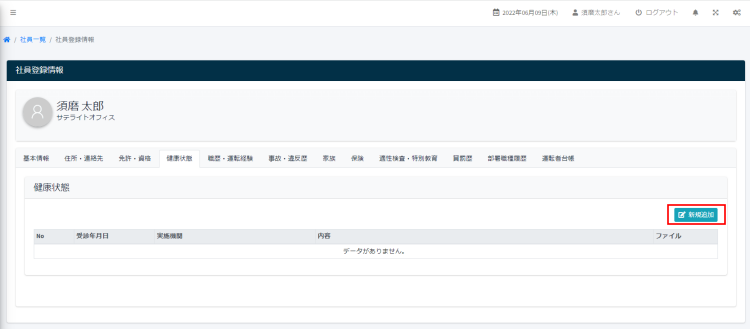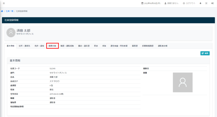 3. 社員登録情報が表示されたら、健康状態タブをクリックします。