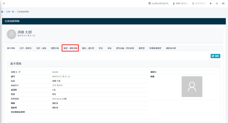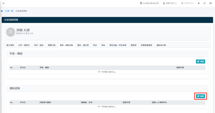 3. 社員登録情報が表示されたら、職歴・運転経歴タブをクリックします。