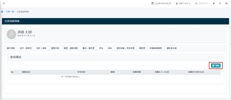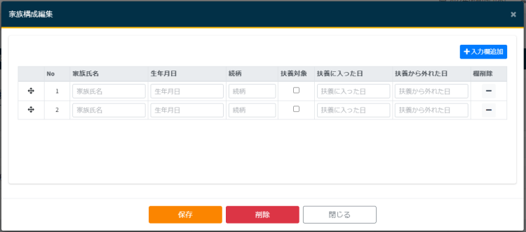 使い方ガイド 社員の設定 家族構成の追加 目次 1.家族構成編集フォームの表示 2.家族構成の編集 1.家族構成編集フォームの表示 サイドメニューの「社員管理」> 「社員一覧」をクリックします。 社員一覧画面から該当する社員をクリックします。 社員登録情報が表示されたら、家族タブをクリックします。 家族構成の編集ボタンをクリックします。 家族構成編集フォームが開きます。 2.家族構成の編集 必要事項を入力し、保存ボタンをクリックします。 ※入力欄が足りない場合は、画面右上の入力欄追加をクリックしてください。 使い方ガイド, 社員の設定 家族構成, 社員
