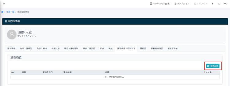 - 社員登録情報が表示されたら、適正検査・特別教育タブをクリックします。